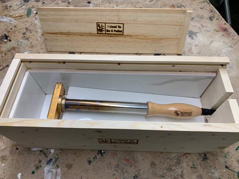 WorkshopP346 – Branding Iron Case/Stand January 12, 2020January 17, 2020 Ray Young The ceramic tiles that line the storage box allows the branding iron to heat up in the box. Share this: Click to share on X (Opens in new window) X Click to share on Facebook (Opens in new window) Facebook Like Loading...